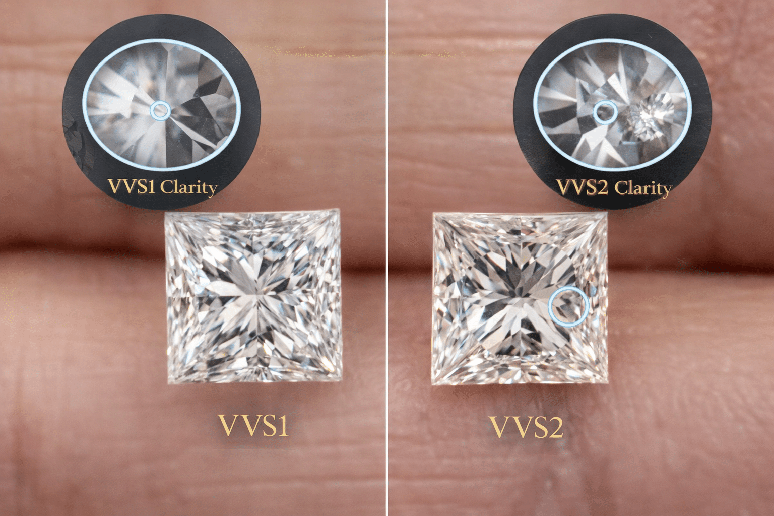 The only technical distinction between VVS1 and VVS2 is inclusion location. VVS1 inclusions sit on the pavilion side, making them nearly impossible to find even under magnification, while VVS2 inclusions may appear on the crown side, slightly more locatable under careful examination.
